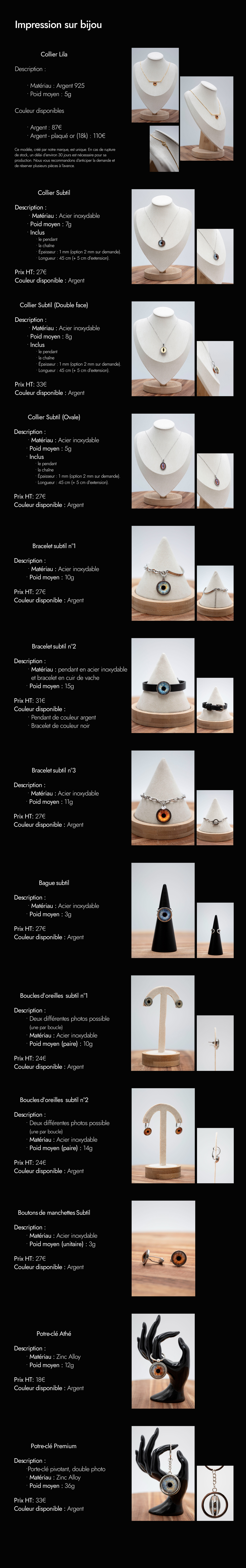 L’impression d’iris sur bijou capture la beauté unique de votre regard dans une création élégante et durable. Grâce à une reproduction haute définition protégée par un procédé résistant à la lumière et au temps, chaque iris révèle ses détails, ses couleurs et sa profondeur avec une netteté remarquable.