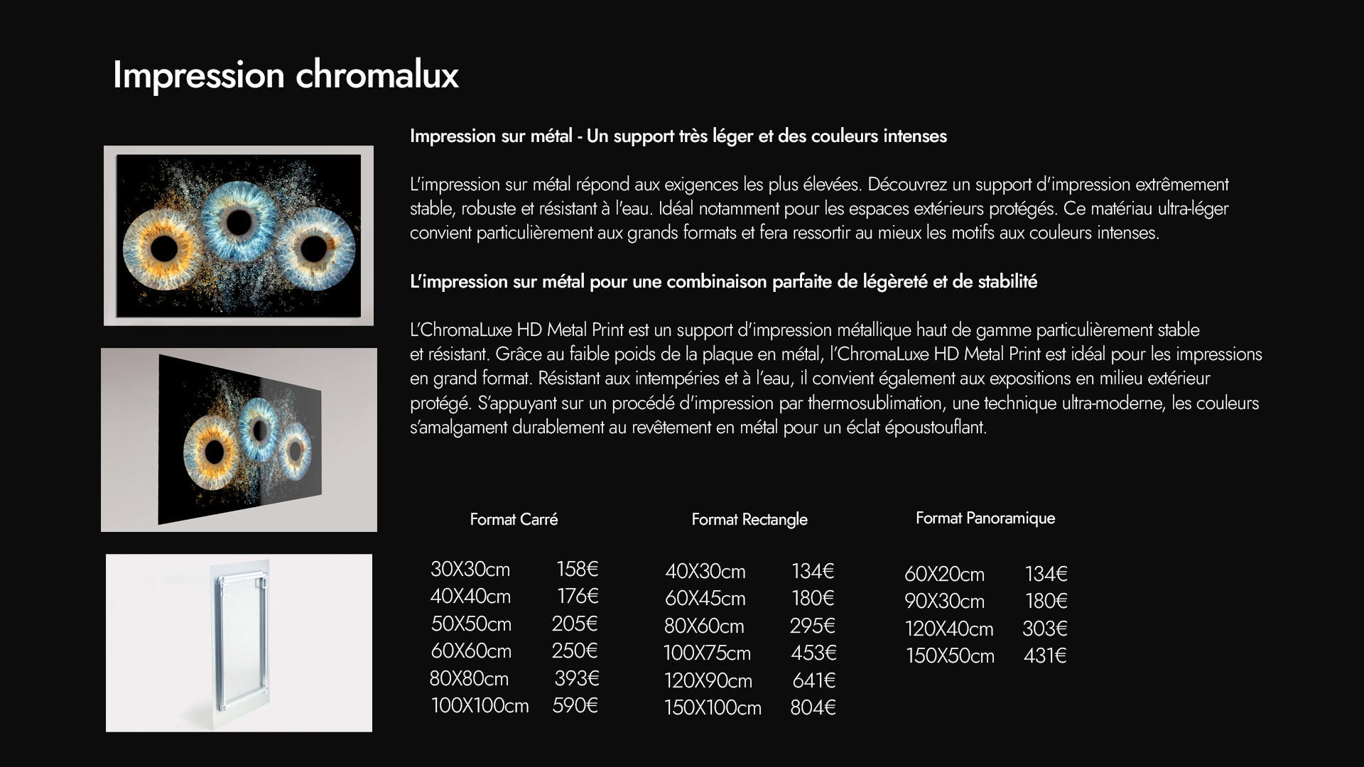 Le ChromaLuxe HD Metal Print est un support d’impression haut de gamme, particulièrement stable et résistant. Grâce au faible poids de la plaque métallique, il est parfait pour les grands formats. Résistant à l’eau et aux intempéries, il peut être exposé en extérieur protégé.
