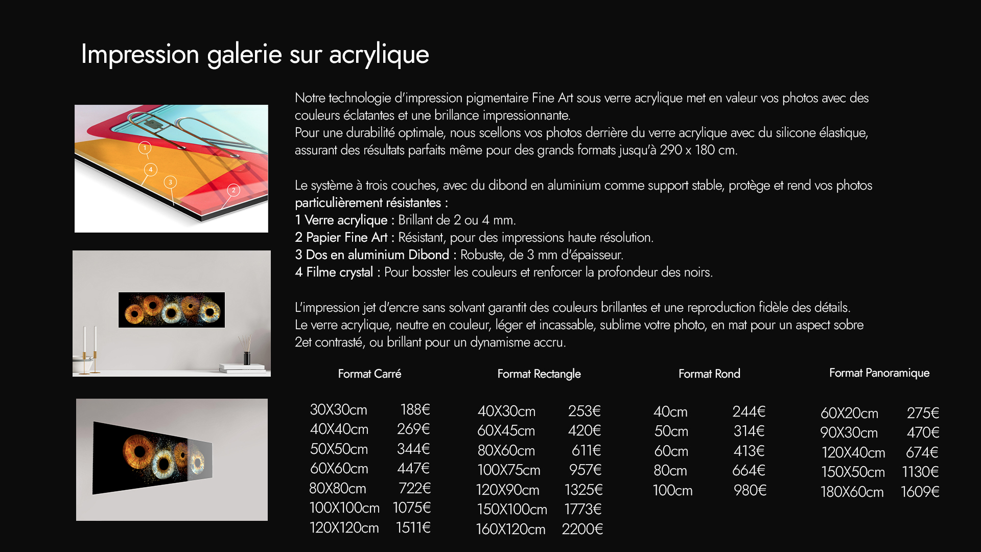 En résumé, le verre acrylique est parfait pour sublimer vos tirages photo, apportant éclat et profondeur à vos images tout en assurant une présentation élégante et moderne.